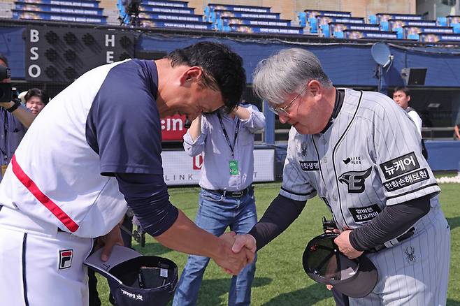 김경문 감독, 6년 만에 잠실 구장 찾아 베이징 올림픽 당시 선수였던 이승엽 두산 감독을 만나 훈훈한 모습 연출.