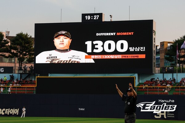 류현진: KBO리그 역대 15번째 개인 통산 1300탈삼진 달성 (4회 말 무사 1,2루 상황에서 송성문 헛스윙 삼진)