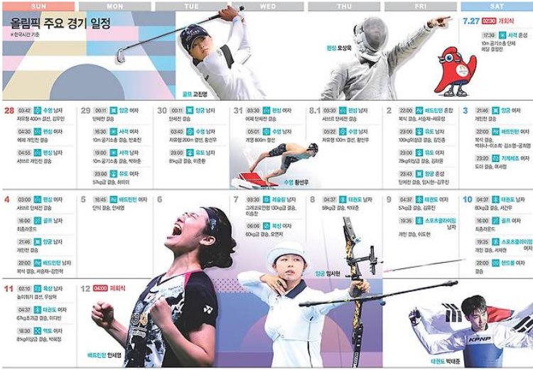 한국의 ‘골든 데이’는 29일 오후부터 30일 오전까지 이어지는 시간대로 전망된다. 우리의 메달텃밭인 양궁과 사격, 수영에서 무더기 금메달이 예상되는 일정이므로 많은 응원이 필요하다. 한국은 이번 대회에 21개 종목에 143명의 선수를 파견했다.