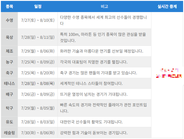 한국의 ‘골든 데이’는 29일 오후부터 30일 오전까지 이어지는 시간대로 전망된다. 우리의 메달텃밭인 양궁과 사격, 수영에서 무더기 금메달이 예상되는 일정이므로 많은 응원이 필요하다. 한국은 이번 대회에 21개 종목에 143명의 선수를 파견했다.