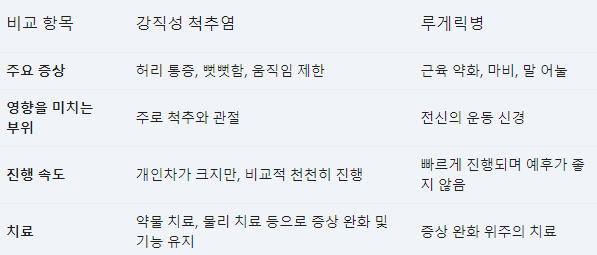 강직성 척추염과 루게릭병은 모두 난치성 질환이지만, 질병의 특성이 매우 다르므로 정확한 진단과 적절한 치료가 중요합니다. 강직성 척추염은 조기에 진단하고 적절한 치료를 받으면 증상을 완화하고 질병의 진행을 늦출 수 있습니다.