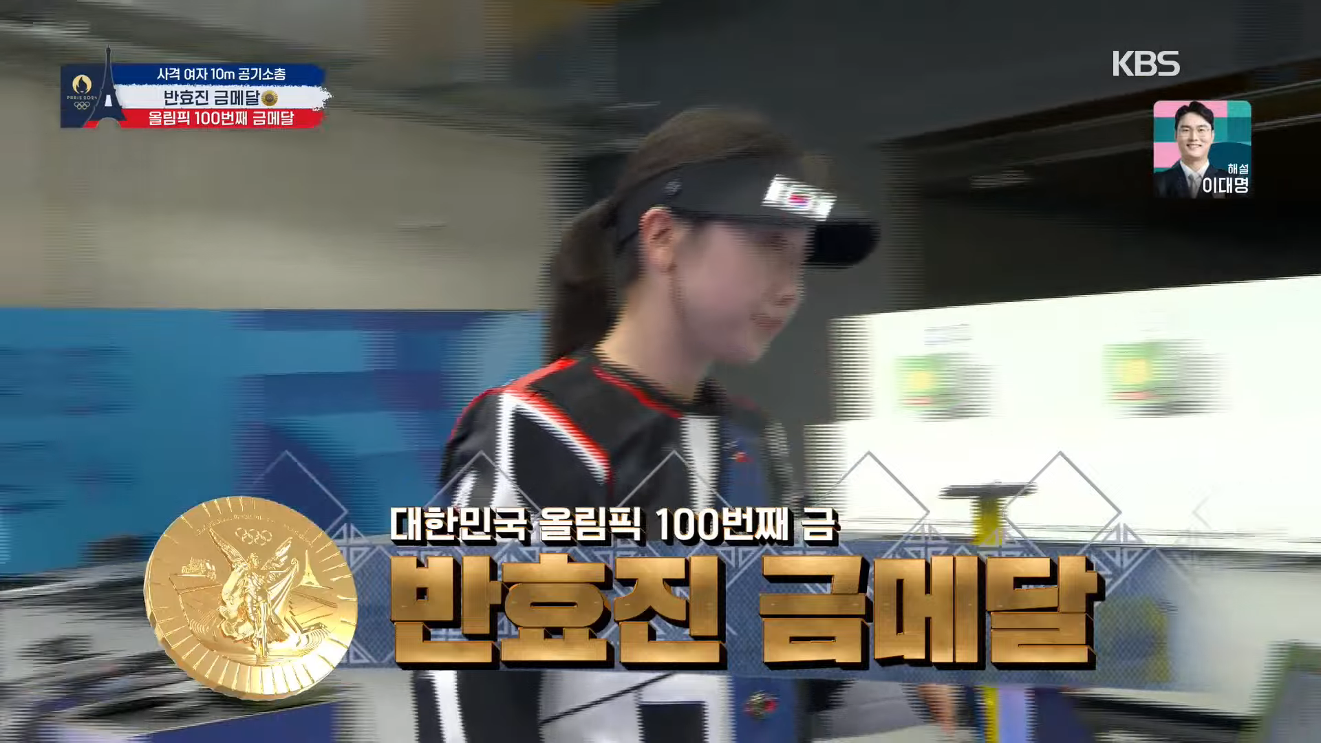 1) 대한민국 올림픽 100번째 금메달: 반효진 선수가 2024 파리 올림픽 사격 여자 10m 공기소총 결선에서 금메달을 획득하며, 대한민국 올림픽 역사에 빛나는 100번째 금메달을 선사했습니다.