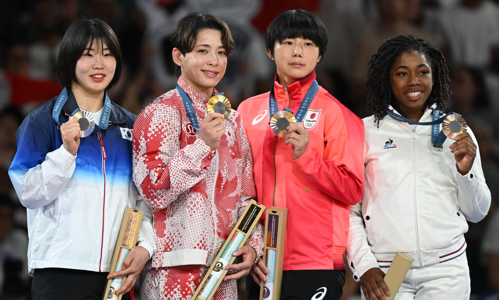 파리 올림픽 유도 여자 57kg급 입상자들. 왼쪽부터 허미미, 캐나다의 크리스타 데구치, 일본의 후나쿠보 하루카, 프랑스의 사라레오니 시지크. (사진 = 올림픽사진공동취재단)