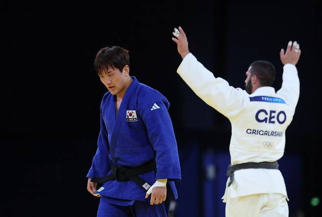 이준환이 2024 파리올림픽 유도 남자 81kg급 준결승에서 조지아의 타토 그리갈라쉬빌리에게 패한 뒤 아쉬워하고 있다. (사진 = 연합뉴스 )