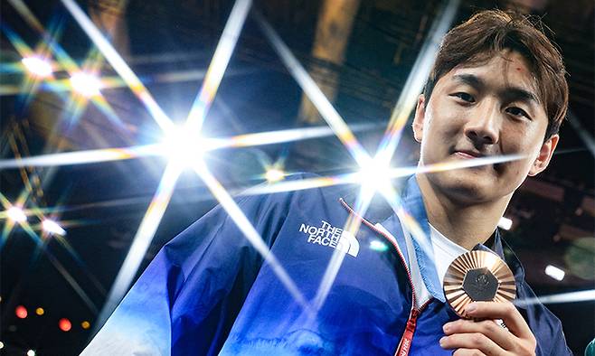 이준환 선수가 2024 파리올림픽 유도 남자 -81kg 시상식에서 동메달을 들고 포즈를 취하고 있다. (사진 = 뉴스1 )