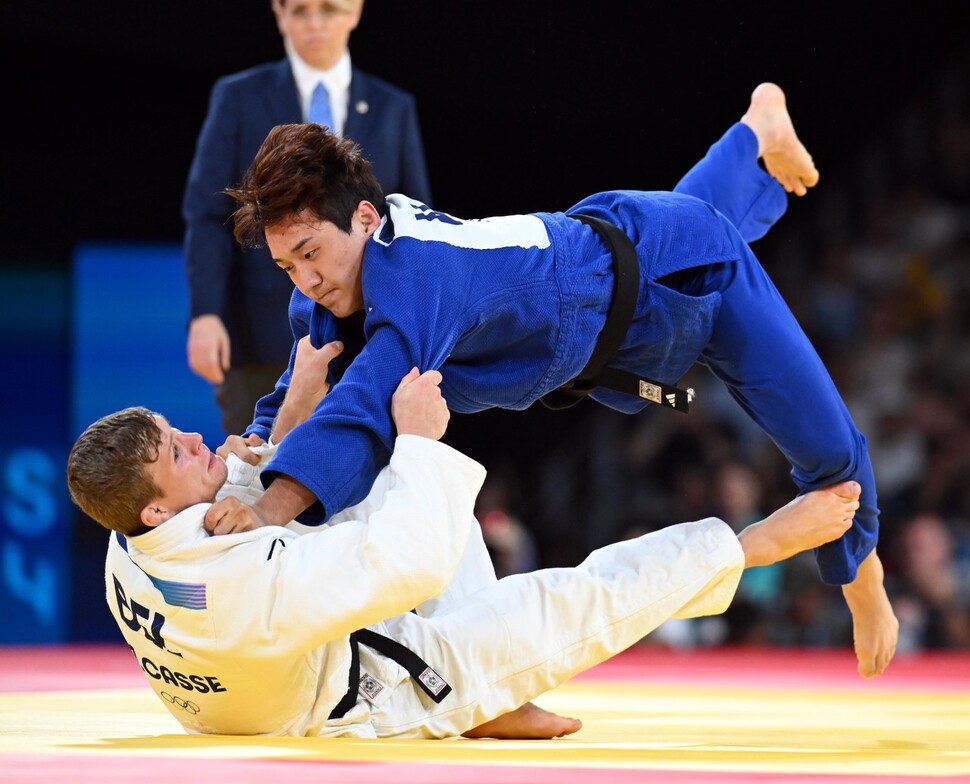 2024 파리올림픽 유도남자 81kg급에 출전한 이준환이 동메달 결정전에서 벨기에 마티아스 카세와의 경기에서 발뒤축걸기로 동메달을 따내고 있다. (사진 = 한겨레/올림픽사진공동취재단 )