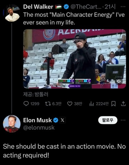 2. 매력적인 이미지: 김예지는 경기 중 차가운 표정과 독특한 스타일(캡 모자와 조준경)로 강렬한 인상을 남겼습니다. 이 모습이 영화의 주인공처럼 보인다는 평가를 받으며, 많은 네티즌들의 관심을 끌었습니다.