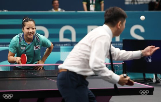 파리 올림픽 탁구대표팀 훈련에 격려차 방문한 유승민 대한탁구협회 회장 겸 국제올림픽위원회(IOC) 선수위원이 신유빈 선수와 연습을 하고 있다. (사진 = 연합뉴스 )